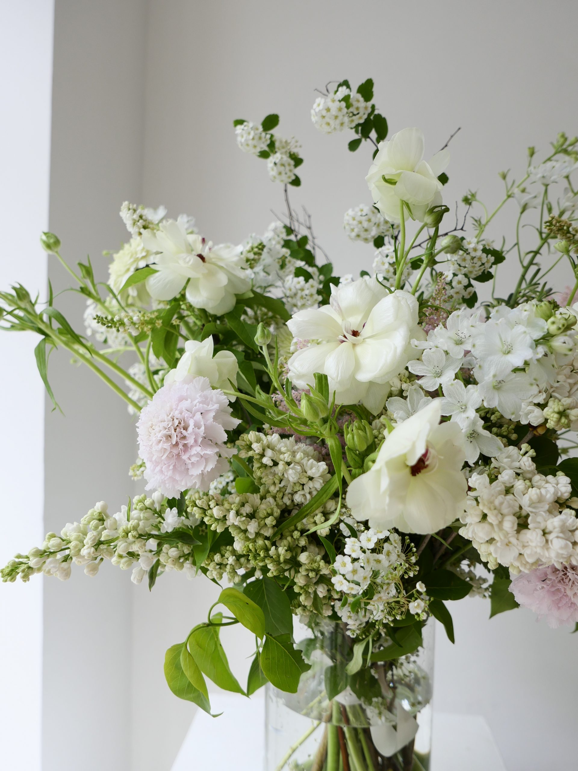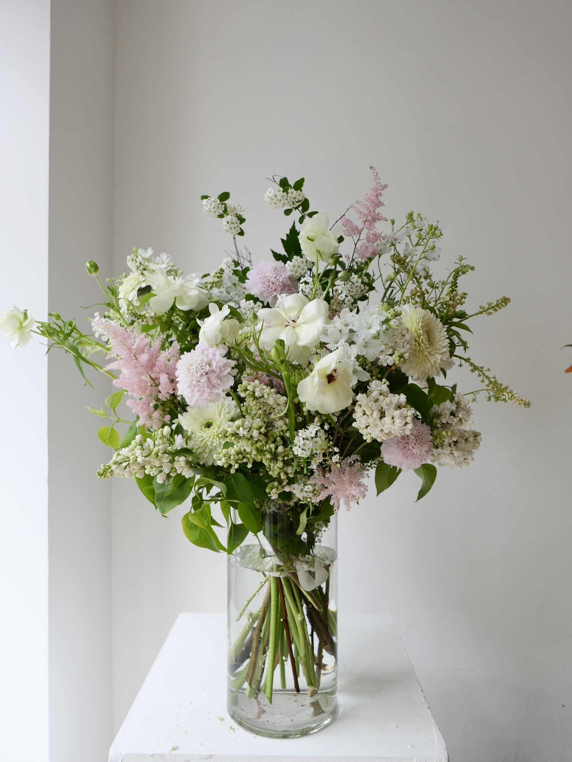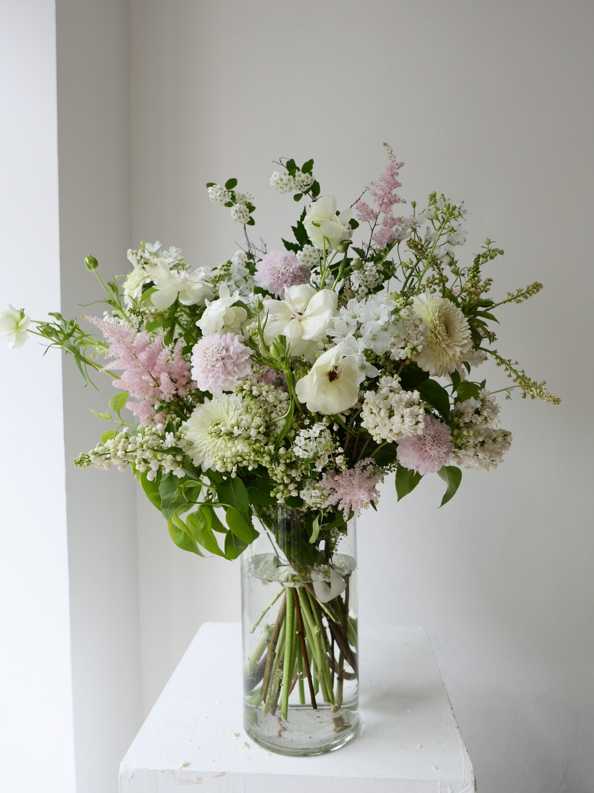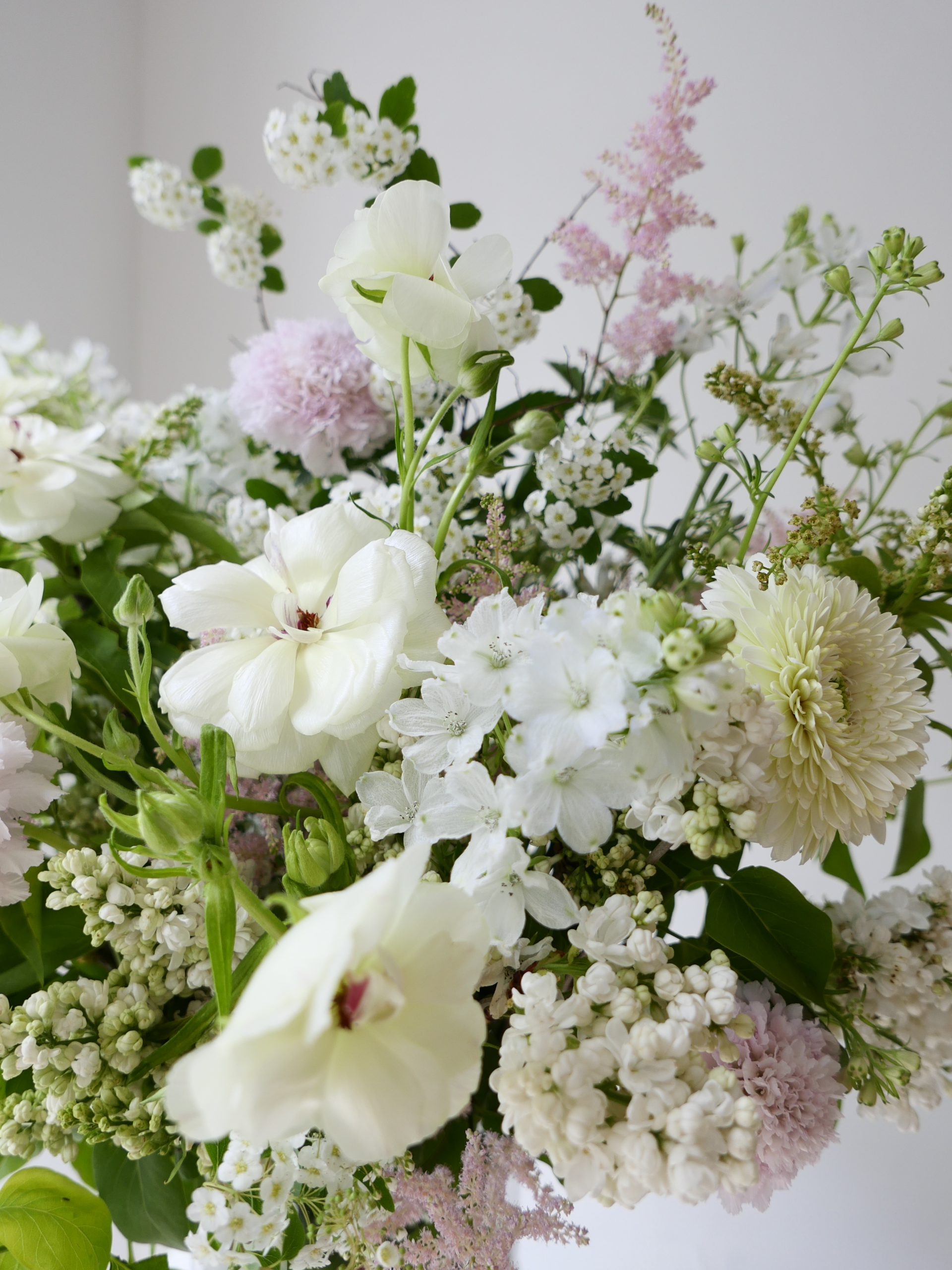 Ce bouquet « style jardin » allie la noblesse des premières roses de jardin à la légèreté des renoncules Butterfly et de l’astilbe vaporeuse. Ses nuances blanches et rose pâle offrent un hommage lumineux, tout en reflets nacrés.