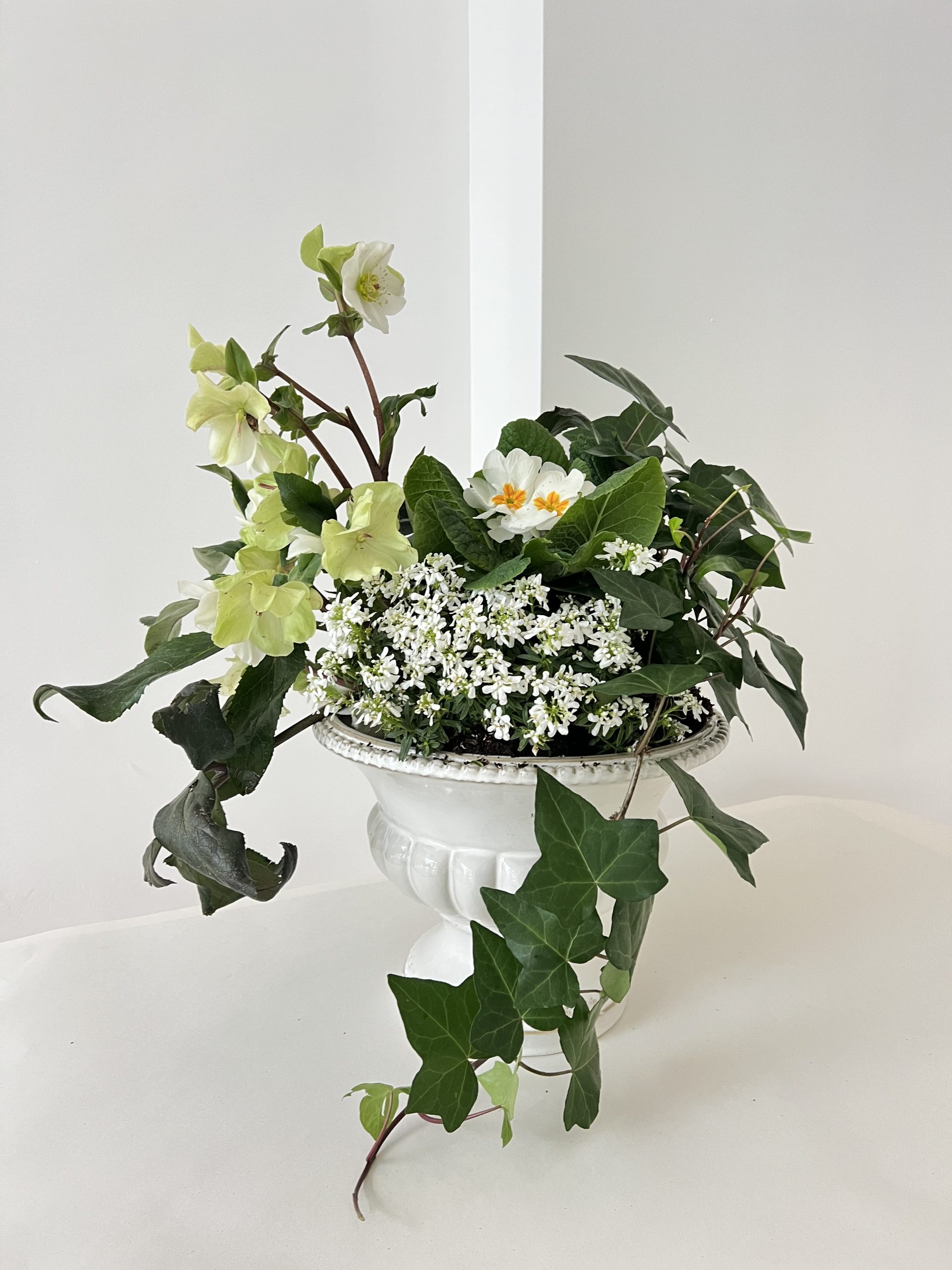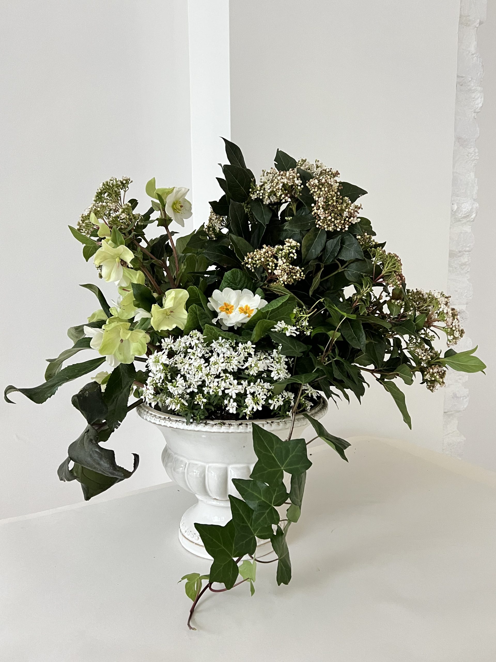Coupe de plantes pour deuil, cadeau d’adieu qui refleurira saison après saison. Bruyère, hellebores blanches, cyclamens… Une sélection aux teintes claires et apaisante dans un contenant chiné par nos soins.