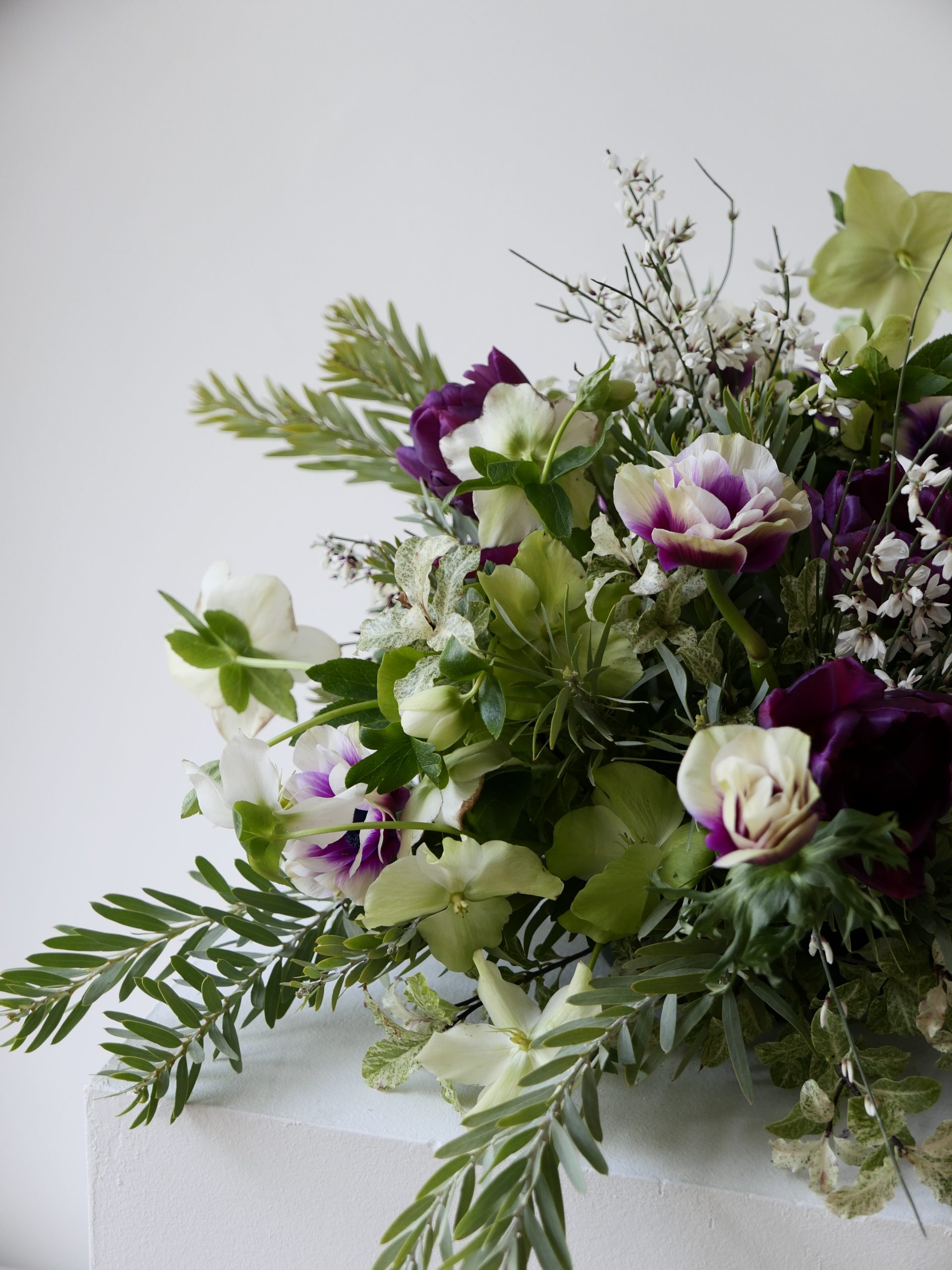 Les anémones évoquent le souvenir et la fragilité de l’instant, tandis que la tulipe violette symbolise le respect, la profondeur des sentiments et l’élégance du cœur.