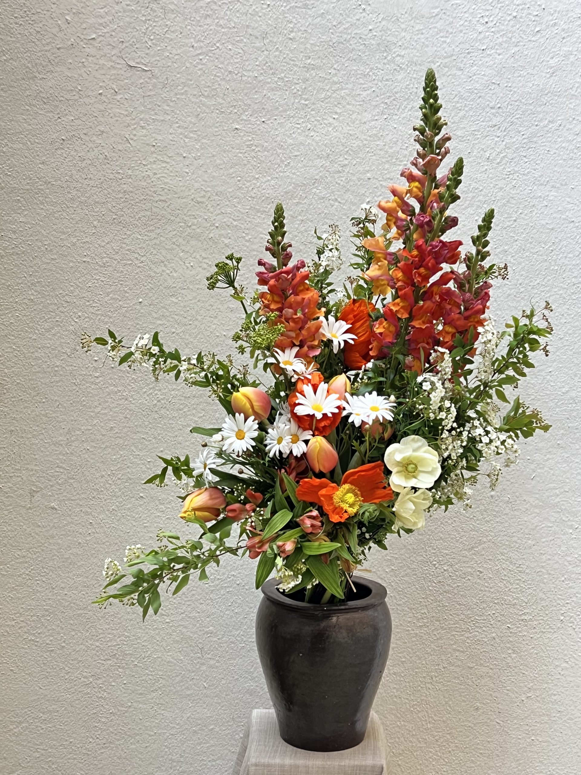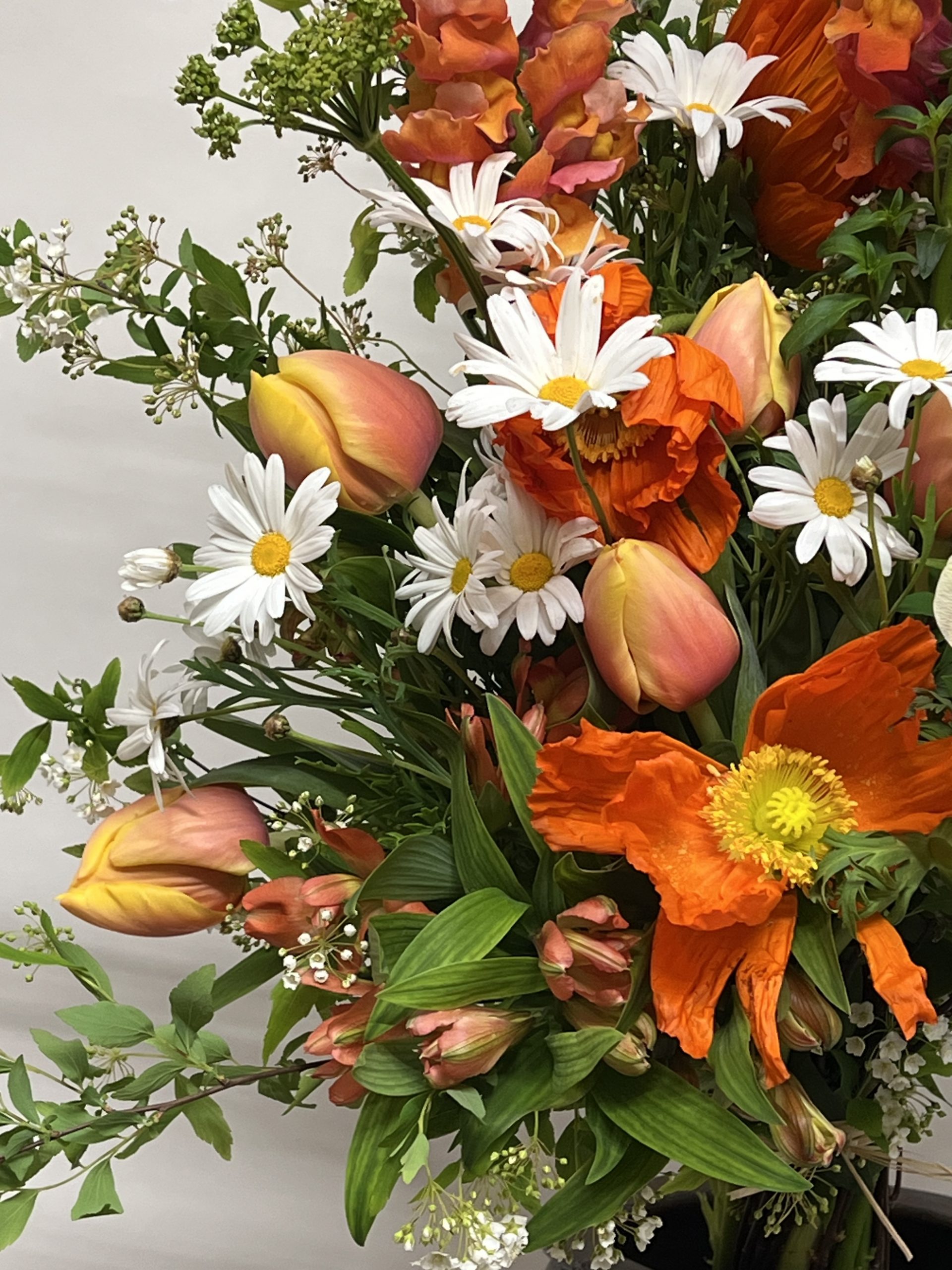 Le retour du printemps, la fin d’un cycle et le début d’un nouveau. C’est tout cela que représente cette gerbe de fleurs de saison constituée de pavots délicats, de tulipes coucher de soleil, de branches de spirées et de marguerites. Une composition aux teintes chaudes, réconfortantes et solaires.