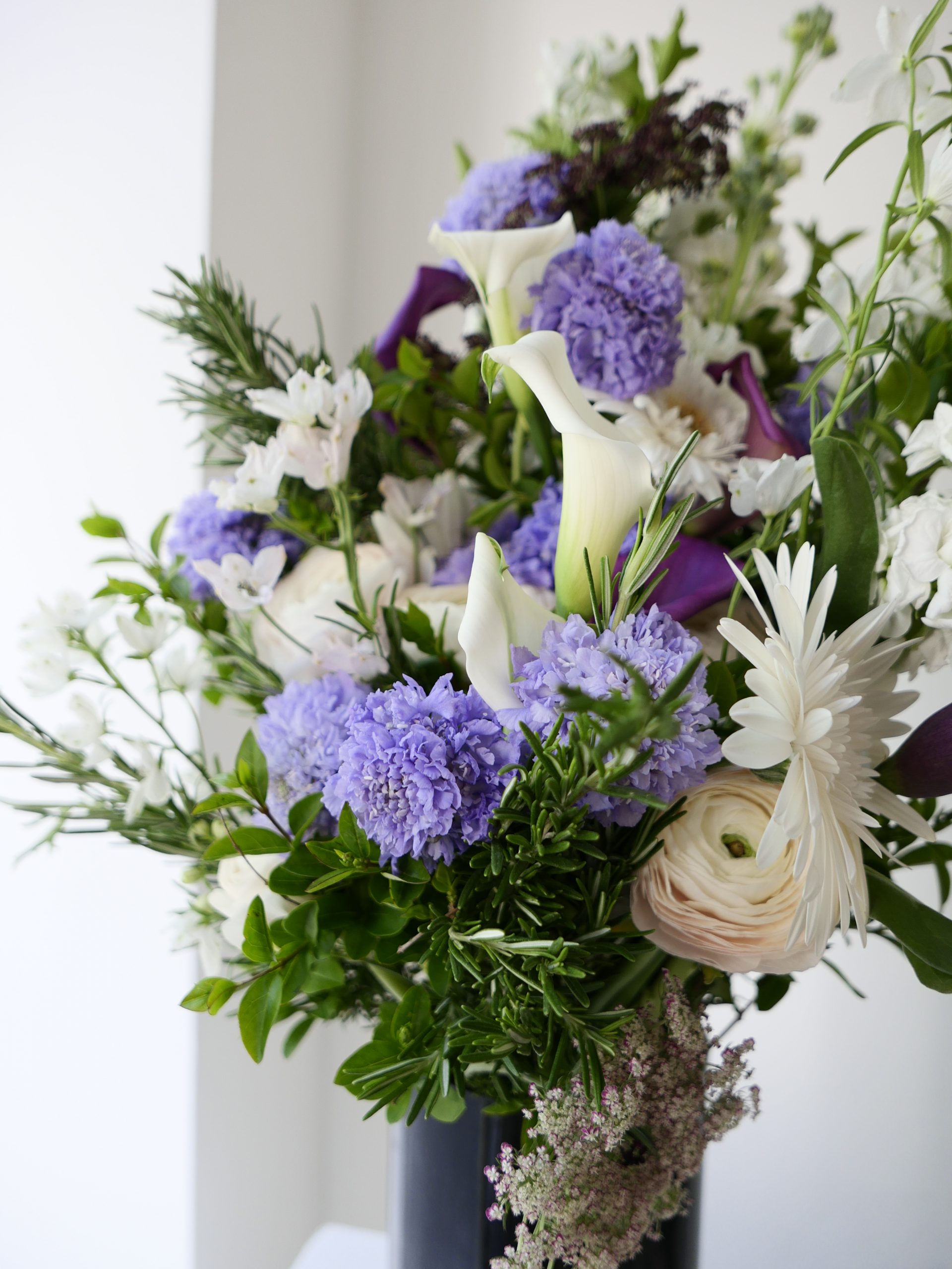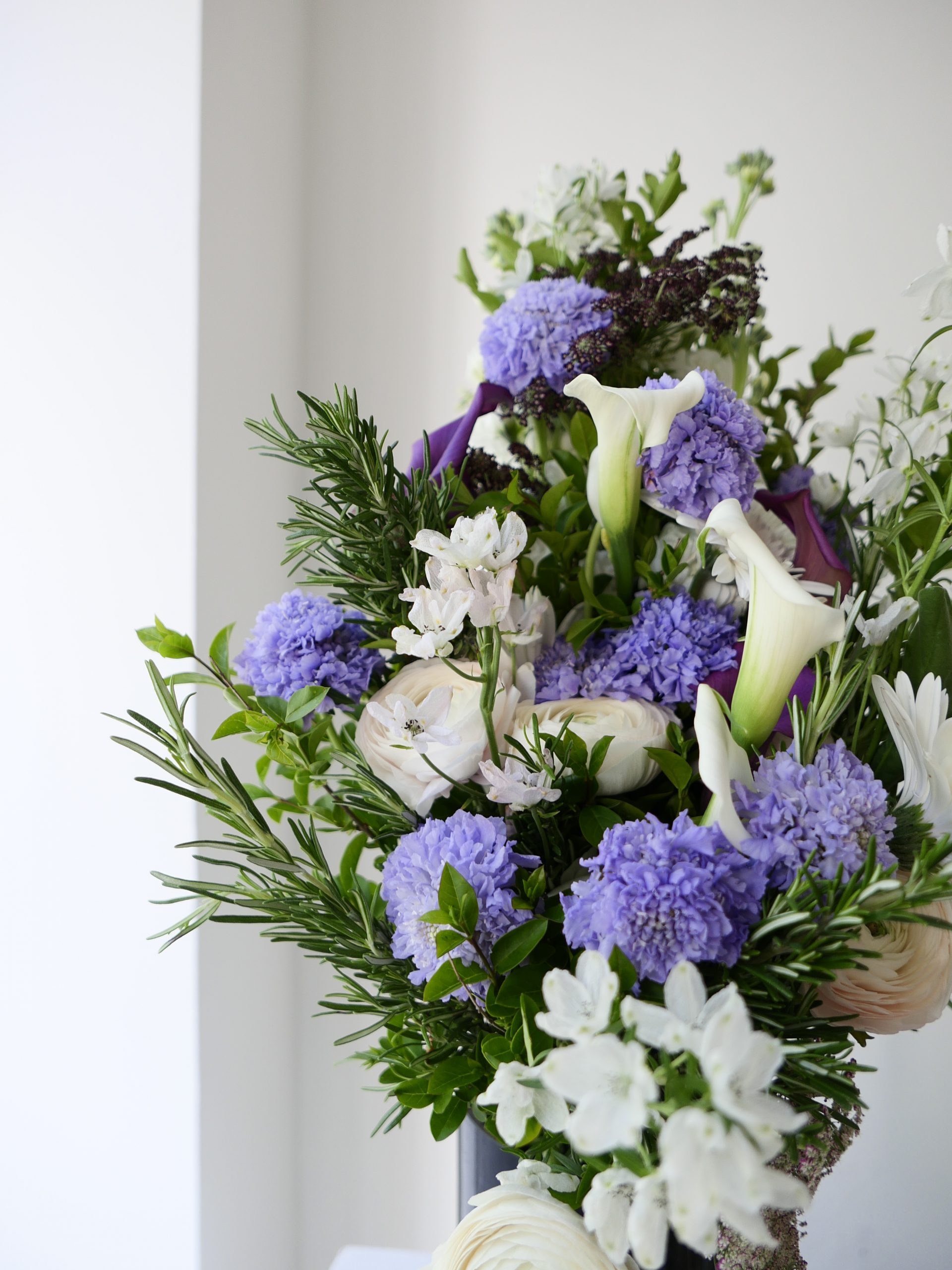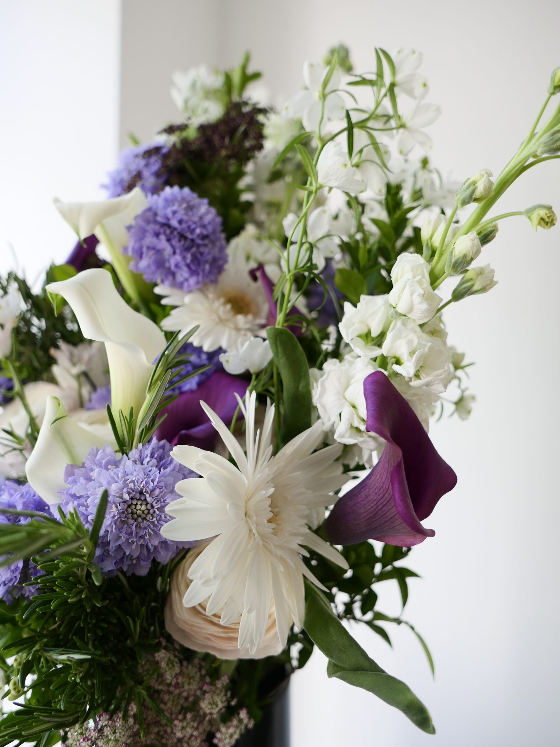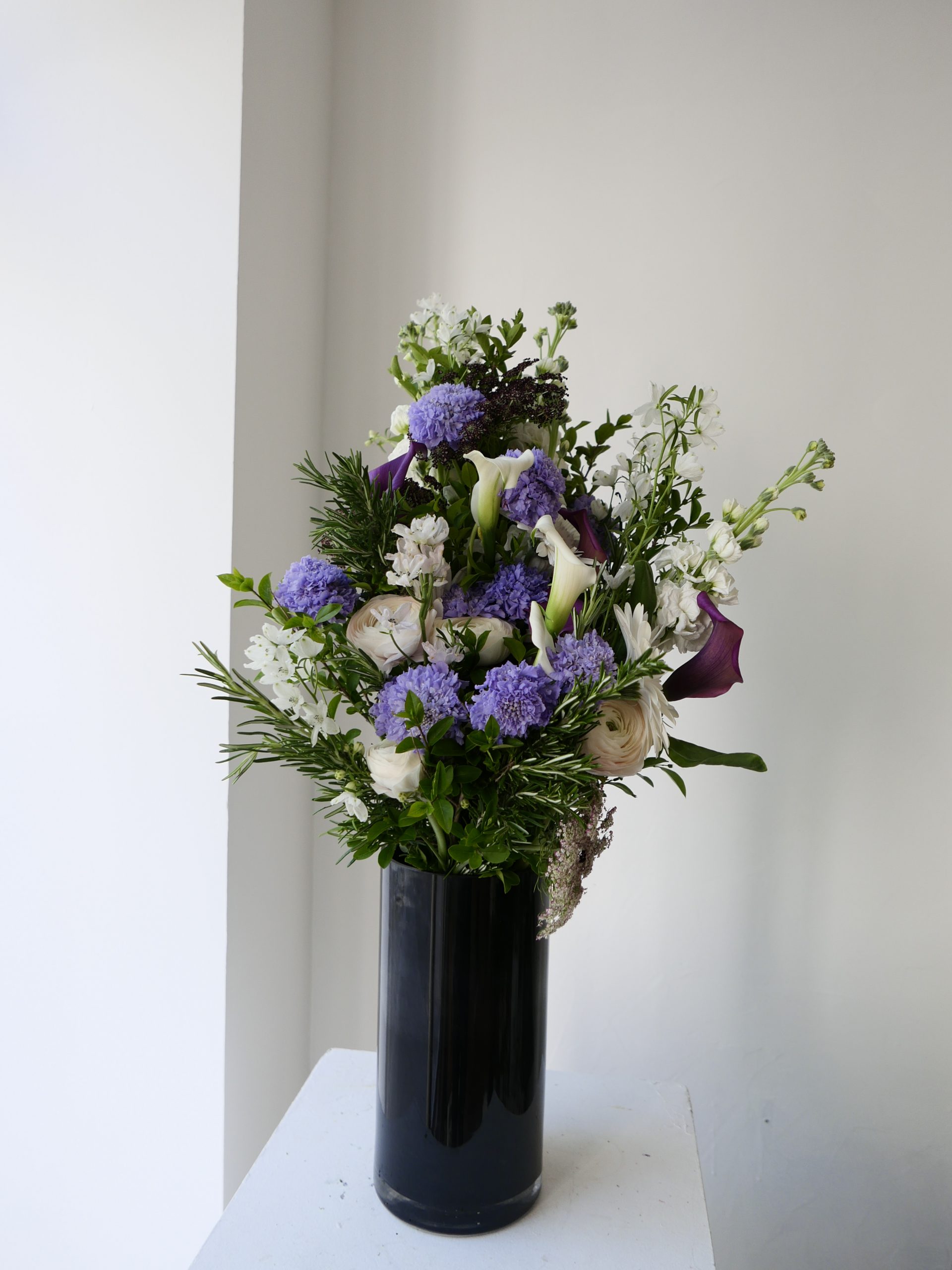 Gerbe de deuil inspirée des nuances d’une nuit printanière, où les tons mauve et parme se mêlent en un dégradé profond, presque velouté.  Giroflées, scabieuses et callas s’y déploient avec relief, captant la lumière comme au crépuscule, entre ombre douce et éclats plus clairs. Le romarin s’intègre à l’ensemble comme un fil végétal, discret mais présent, apportant une respiration naturelle et une note fidèle au souvenir. Format plus petit qu’une gerbe piquée, conçu pour un hommage intime et discret.