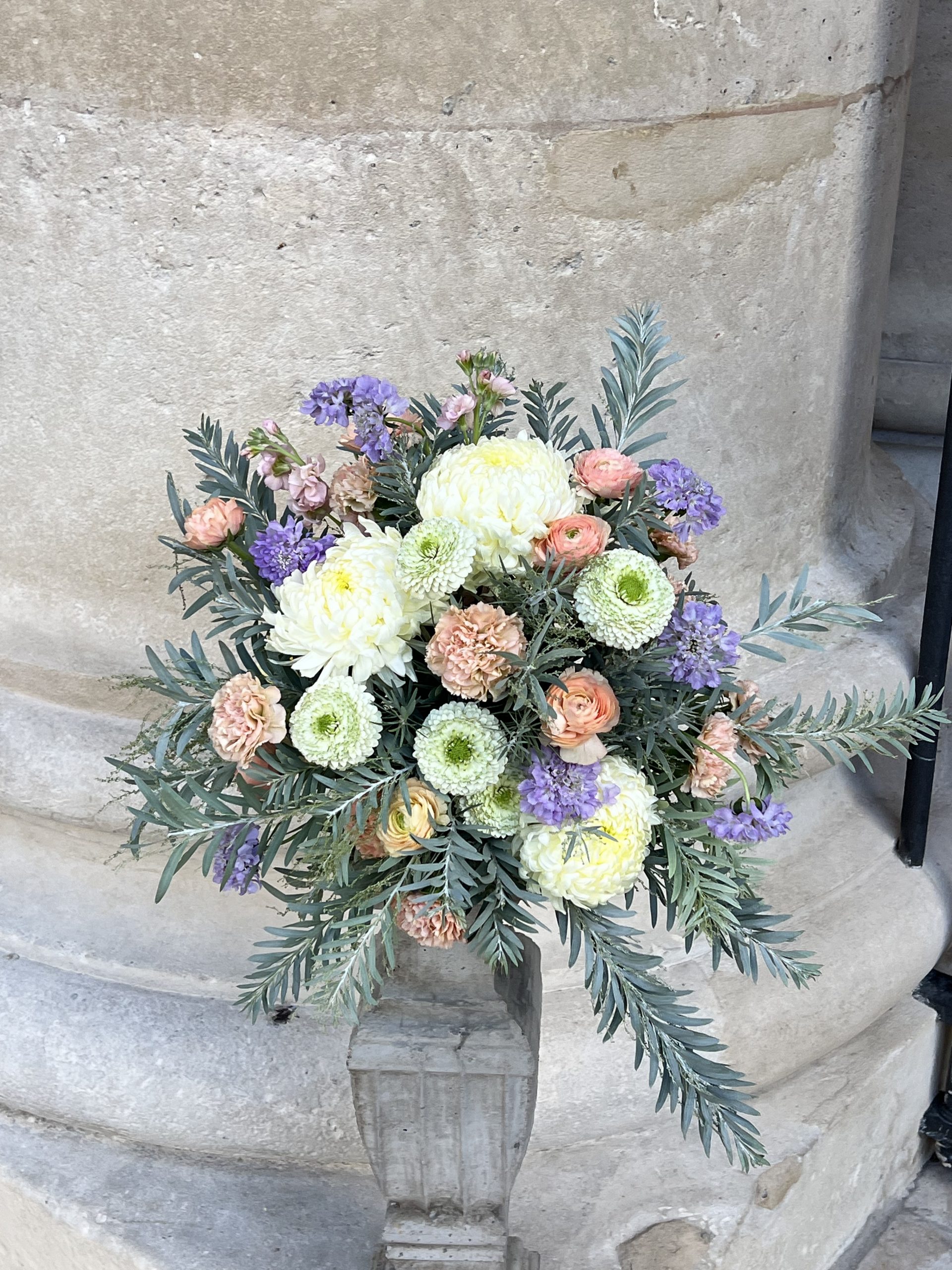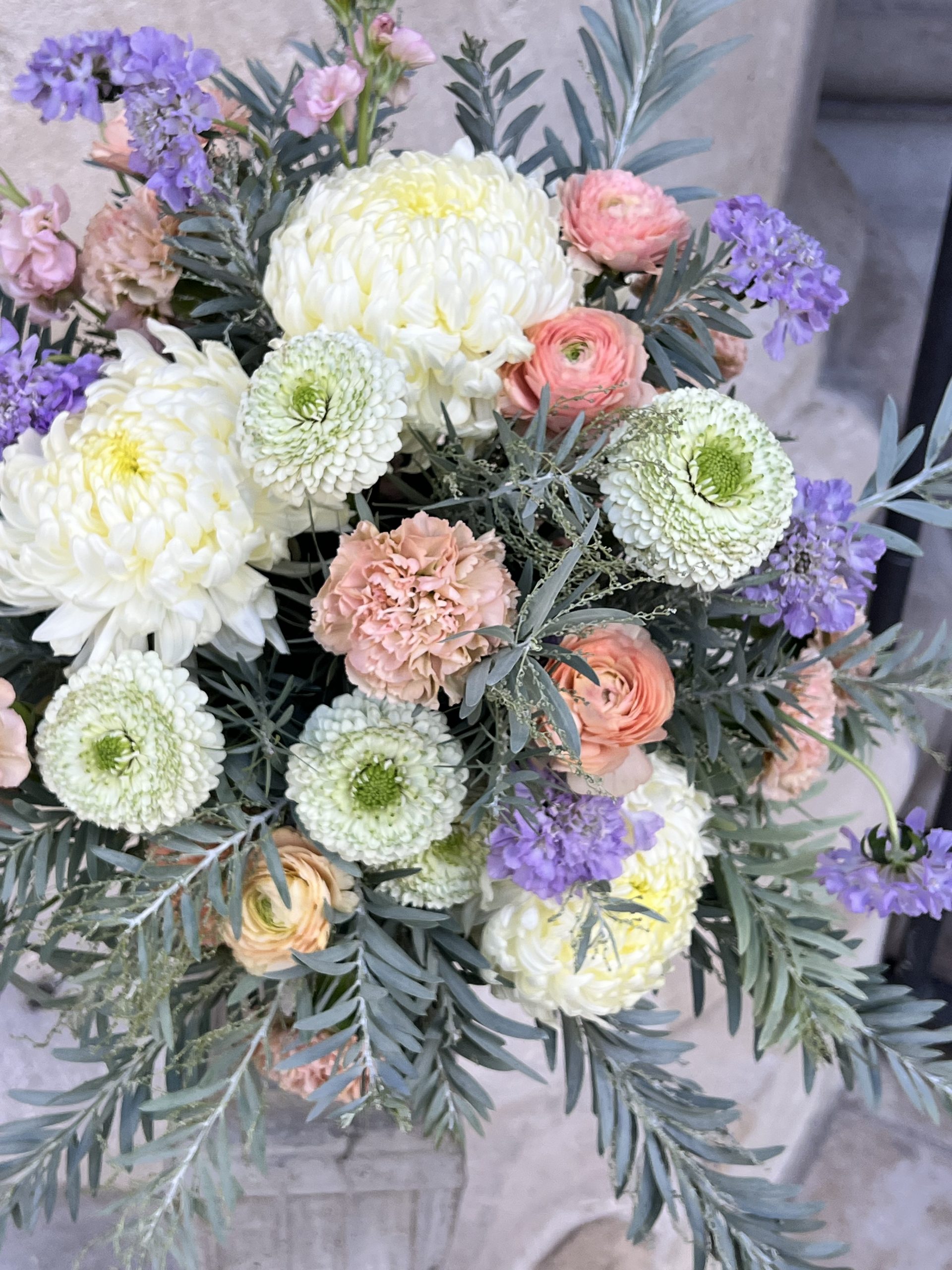 Fleurs principales : Œillets beige, chrysanthèmes blancs, scabieuses mauves